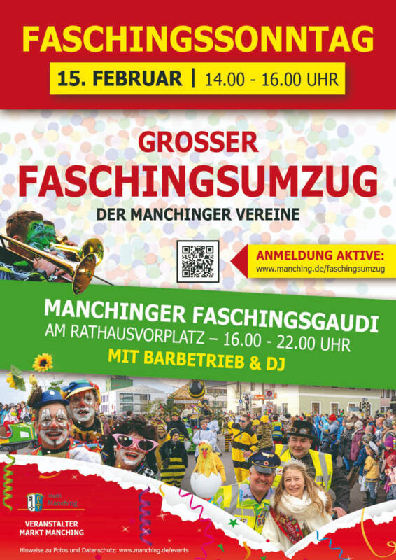 Faschingsumzug Am Faschingssonntag, den 15. Februar 2026, findet der Faschingsumzug durch Manching bereits zum 35. Mal statt. Im Anschluss wird am Rathaus-Vorplatz die 5. Manchinger Faschingsgaudi gefeiert. Beginn ist wie auch in den letzten Jahren um 14:00 Uhr. Der Zug beginnt im Gewerbegebiet und führt über die Autobahnbrücke auf der Ingolstädter Straße in Richtung Ortsmitte. Die Aufstellung der teilnehmenden Gruppen und Vereine beginnt bereits um 12:00 Uhr im Gewerbegebiet westlich der Autobahn.