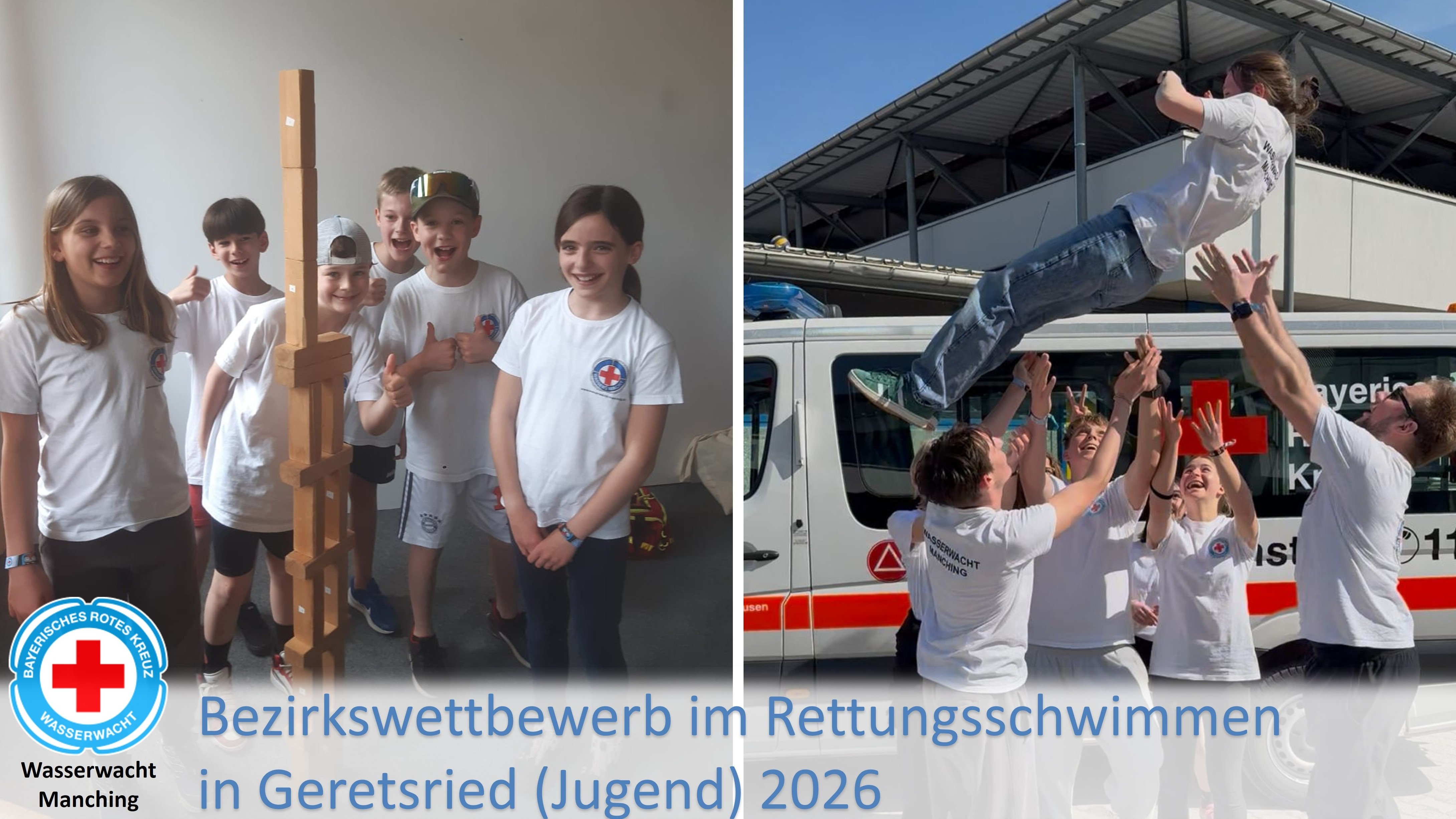 Stufe I aus Manching belegt dritten Platz Am Wochenende vom 17.04 – 19.04.2026 fand in Geretsried der diesjährige Bezirkswettbewerb im Rettungsschwimmen JUGEND der Wasserwacht Oberbayern statt. Auch die angehenden Rettungsschwimmer der Wasserwacht Ortsgruppe Manching durften mit drei Teams für die Kreiswasserwacht Pfaffenhofen antreten: Sie konnten sich im Vorfeld beim Kreiswettbewerb in der KWW Pfaffenhofen durchsetzen und den 1. Platz sichern. Am Freitagnachmittag ging es für die Teilnehmer und ihre Betreuer mit drei Mannschaftsbussen los nach Geretsried, wo der diesjährige Jugendwettbewerb stattfand. Am Austragungsort angekommen wurde sich angemeldet und der Schlafplatz in einer Dreifachturnhalle eingerichtet. Nach der Anreise durfte ein Abendessen natürlich nicht fehlen, dann ging es auch schon bald ins Bett, damit alle für die zwei anstehenden Wettbewerbstage ausgeschlafen und fit sind. Am Samstag mussten die Teilnehmer früh raus, da es nach dem Frühstück und der offiziellen Begrüßung dann auch direkt mit den Disziplinen und Stationen losging. Beim Wettbewerb wurden nicht nur die schwimmerischen Fähigkeiten im Hallenbad abgeprüft. Bei verschiedenen Erste Hilfe-Stationen mussten die Jugendlichen ihr Können in Theorie und Praxis unter Beweis stellen. Auch beim Wasserwacht-Wissen Parcours, den die Teams durchlaufen mussten, wurden Punkte gesammelt. Für die Stufe I ging es direkt ins Hallenbad für den schwimmerischen Teil. Hier treten die Teams in insgesamt sechs Disziplinen gegeneinander an. Es musste z. B. schnellstmöglich durch Ringe getaucht, oder mehrere Bälle auf die andere Seite des Beckens transportiert werden. Auch der richtige Umgang mit Rettungsmitteln wie Rettungsring oder Rettungsboje musste beherrscht werden. Beim Wasserwacht-Parcours, der für Stufe I am Nachmittag stattfand, mussten verschiedene Fragen von der Gruppe beantwortet und Knoten vorgezeigt werden. Diese wurden im Anschluss von den Prüfern bewertet. Der Spaß sollte beim Wettbewerb natürlich auch nicht zu kurz kommen, deshalb gab es für die Kinder und Jugendlichen auch immer wieder Spielestation im Durchlauf. Nach dem Abendessen wurde ein Karaoke-Singen veranstaltet. Die Teams durften sich Lieder aussuchen, die sie zum Besten geben wollten. Das war für alle natürlich ein Riesenspaß … Am Sonntag lag der Schwerpunkt beim Thema „Erste Hilfe“. Hier galt es für die Teilnehmer, als Gruppe verletzte Personen (geschminkte Mimen) fachgerecht zu versorgen und zu betreuen. Die Prüfer beobachteten die durchgeführten Maßnahmen genau und verteilen im Anschluss die begehrten Punkte. Da die Teams aus Manching sich mit ihren Trainern gut vorbereitet hatten, fiel das Feedback hier sehr positiv aus. Bei einer weiteren Station musste eine Person aus einem See gerettet und anschließend richtig versorgt werden. Nach dem Mittagessen warteten alle Teilnehmer gespannt auf die Siegehrung, diese starte pünktlich um 14 Uhr in der Aula der Realschule. Zunächst wurden die Platzierungen des Spielparcours bekanntgegeben. Im Anschluss fand die Siegerehrung des Rettungsschwimmwettbewerbs statt. Die Stufe I aus Manching erreichte einen hervorragenden 3. Platz von 13 Mannschaften. Stufe II belegte den 9. Platz und Stufe III konnte sich den 7. Platz sichern. Glücklich über die sehr guten Platzierungen aber auch sehr müde ging es gemeinsam zurück nach Manching. Hier wurden die Teams von ihren Familien empfangen. Alle freuen sich bereits auf den Wettbewerb im nächsten Jahr!